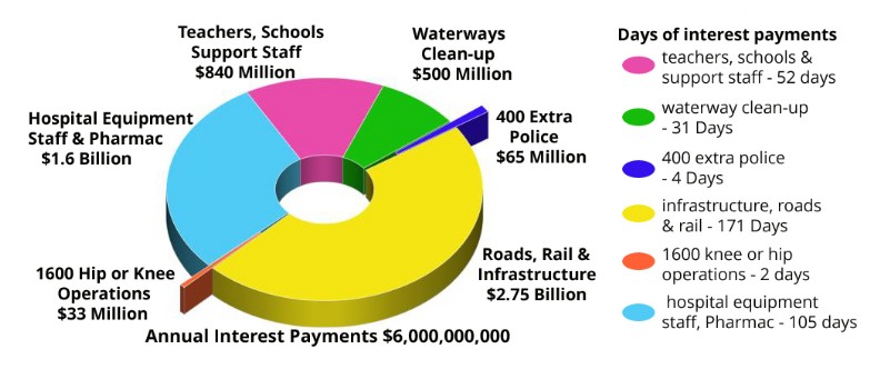 $5 billion dollars of taxpayers money already goes every year to pay interest on existing government debt – money that could be spent on health services, solving the housing crisis by building rent to own homes, providing free dental care, or a multitude of other possibilities.